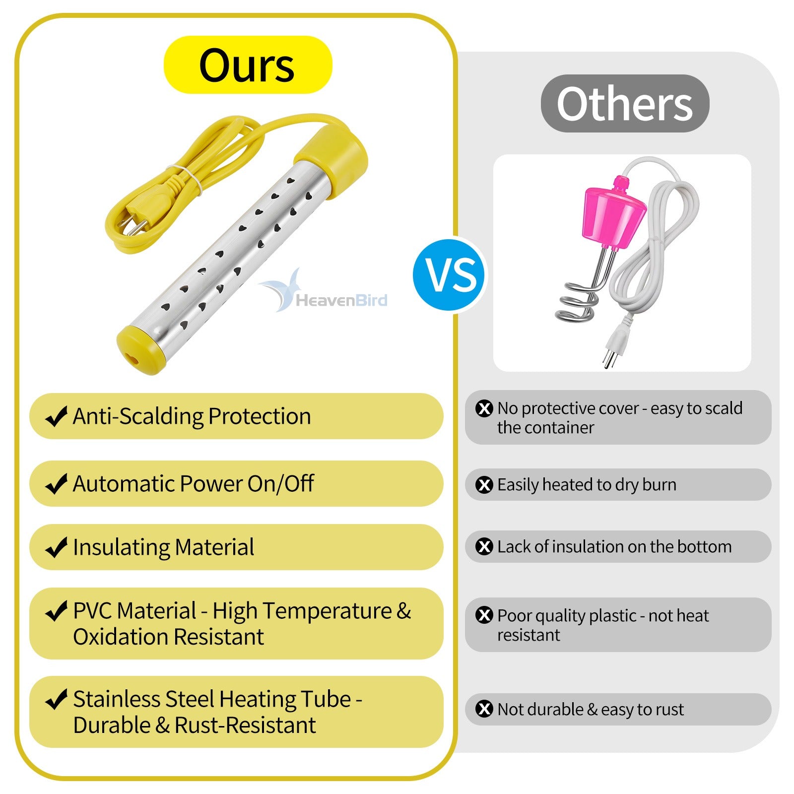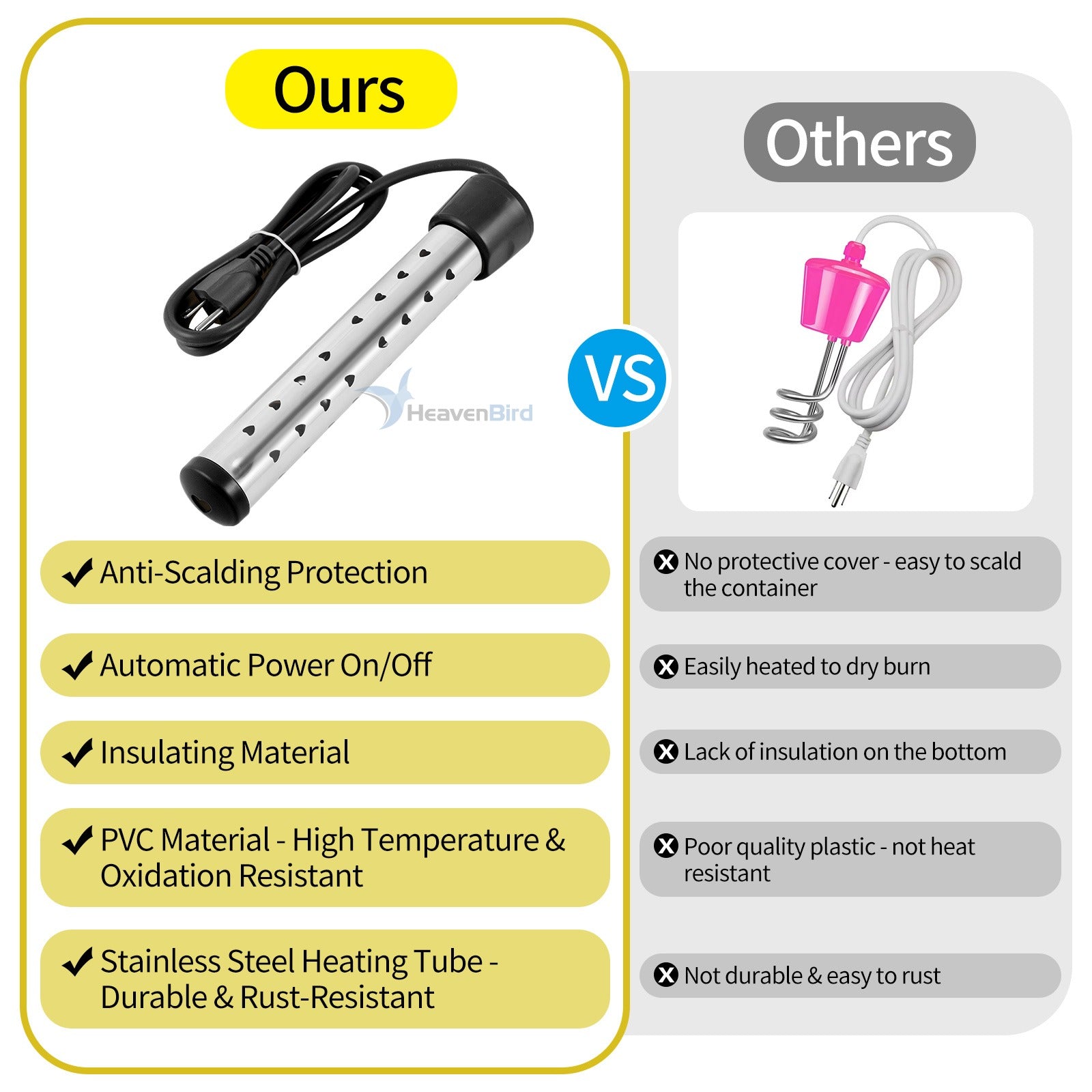 - Simple Operation: Immersion water heater is easy to use, make sure the immersion water heater is fully immersed in water and the water level is sufficient before powering it on. Keep watching and keep hands off. Once water is hot enough or boiling, unplug the heater and wait a few seconds before removing it from the water.