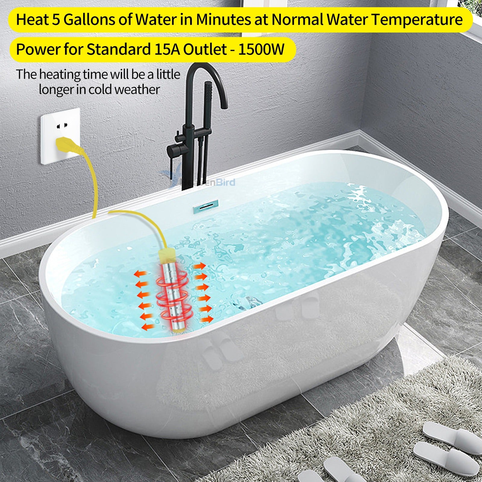 - Fast Heating: 1500W high power fast immersion water heater can heat 5 gallons of ROOM TEMPERATURE WATER in minutes, saving energy and money. If you want to heat up for a shorter time, you can use 2 water heaters at the same time, but be careful NOT to use them on the SAME OUTLET. The heating time will be little longer in cold weather. We recommend a maximum use time of 3 hours. And this immersion heater is ONLY for WATER HEATING.