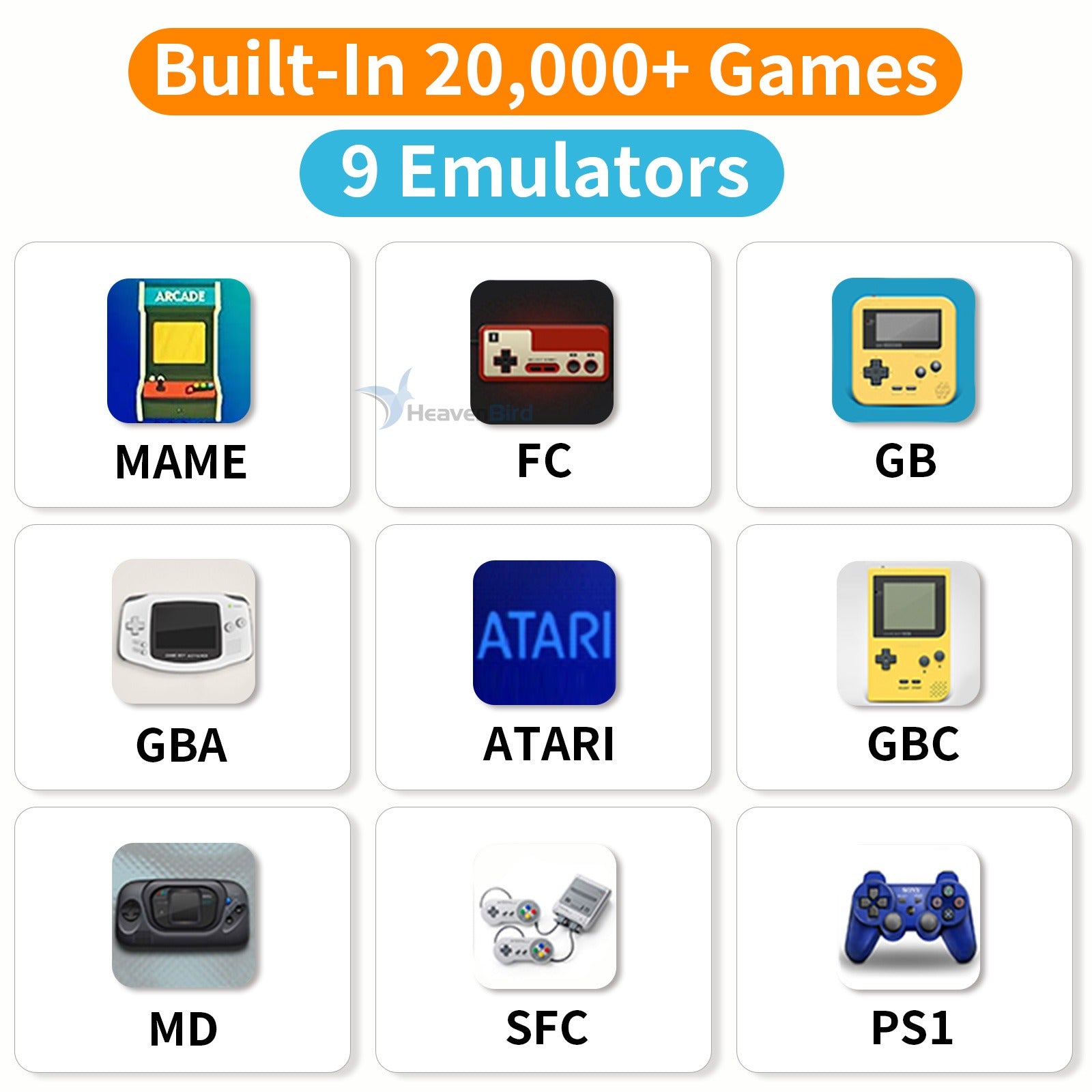 - 🎮【Built-in 20000+ Retro Games】The wireless classic TV game console system has 20,000+ rich games built-in and 10 pre-installed emulators and comes with a 64GB TF card. No need to download and install by yourself. No internet required. Just connect to TV to play 20000+ classic games. Let you play games every day without repetition. Bring your memories back to the fun of childhood and enjoy family entertainment time.